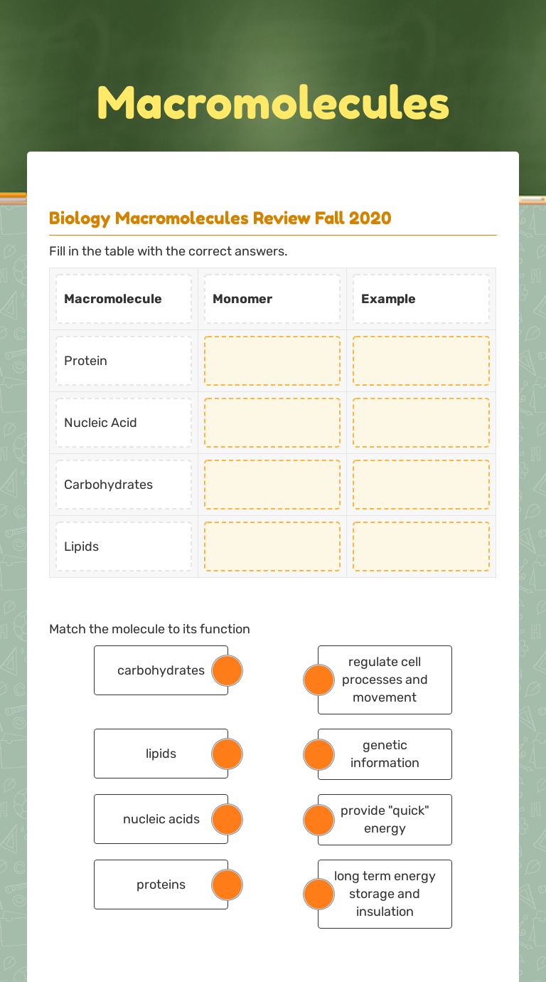 Living things a balance between materials and exiting the. Macromolecules chart worksheets teaching resources tpt. Macromolecules review worksheet for h biology. Organic molecules worksheet review worksheets 44 best macromolecules worksheet hi res wallpaper from organic molecules worksheet review , source: Biochemistry matching exercises, fill in the blanks